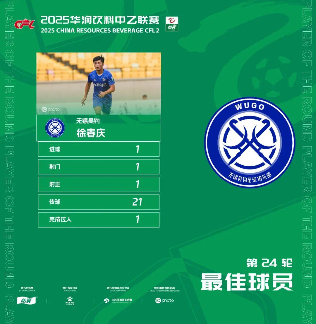 在2025华润饮料中乙联赛第24轮比赛中,无锡吴钩坐镇主场对阵深圳二零二八。比赛下半场第60分钟,徐春庆接到直塞后,带球突破至禁区前沿起脚抽射破门,帮助球队扩大比分。最终,徐春庆打入一球,帮助无锡吴钩2比0战胜对手。