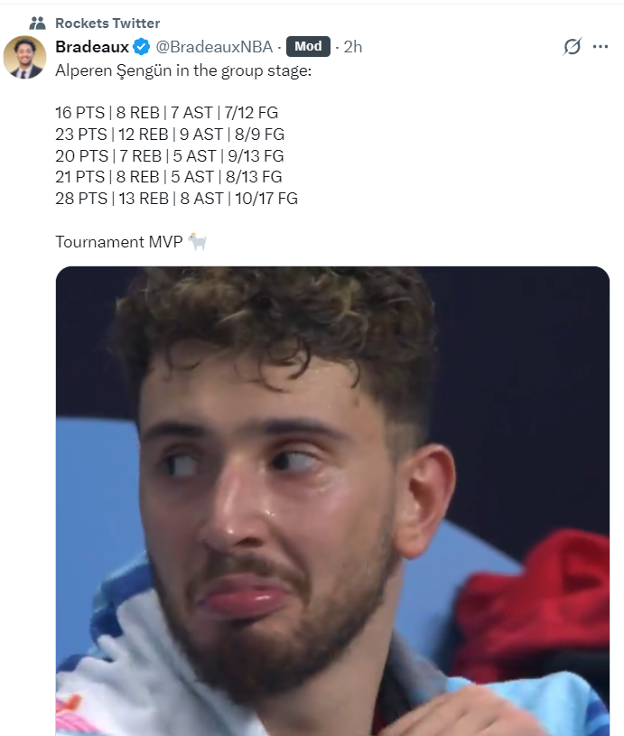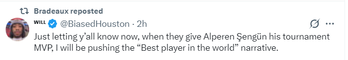 休媒BiaseHouston写道:当他们将欧洲杯MVP奖杯颁发给申京的时候,我会大力的宣传“世界最佳球员”这一称号。