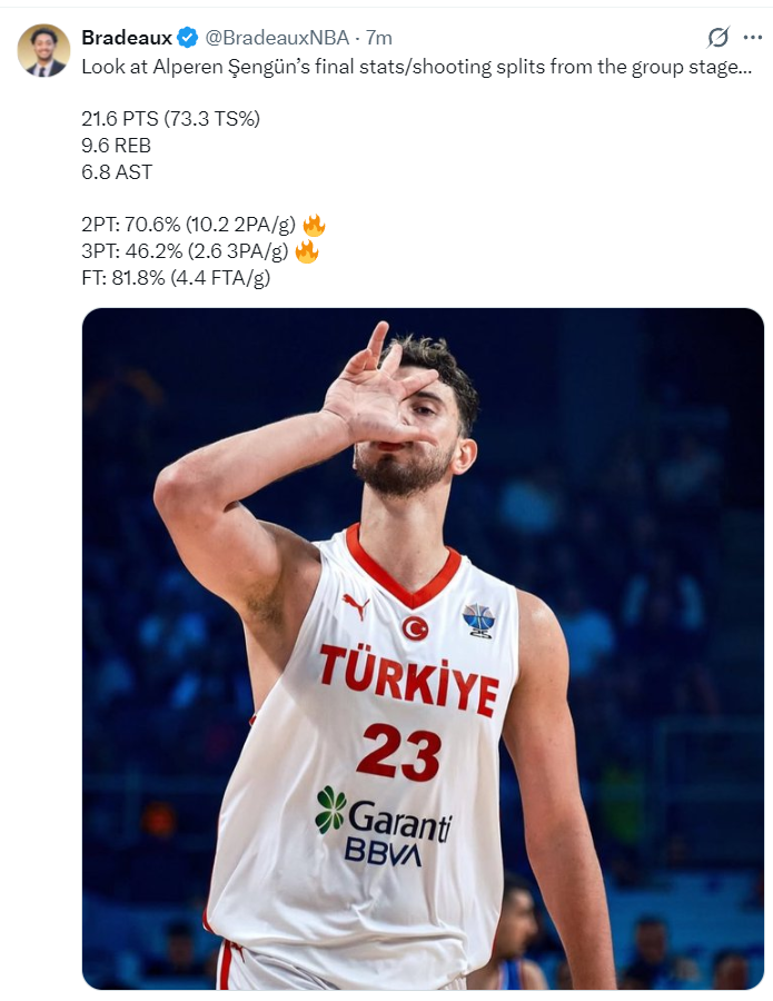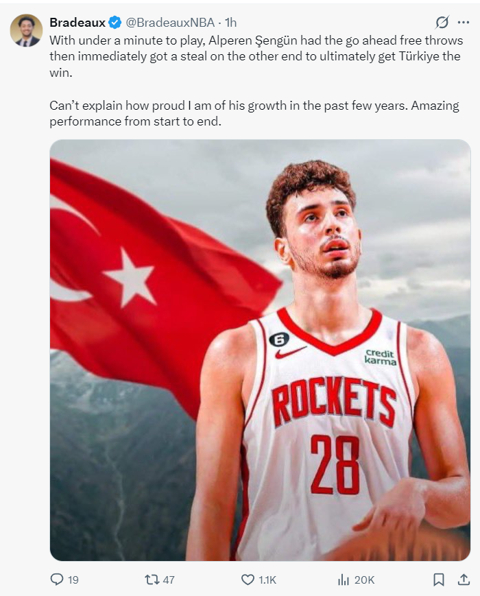 火记Bradeaux写道:比赛剩下不到一分钟,申京两罚全中随后又成功抢断帮助土耳其赢得最终胜利。真的难以用言语来形容我过去几年对他那份成长的喜悦/骄傲之情。从头到尾申京的表现都堪称出色。