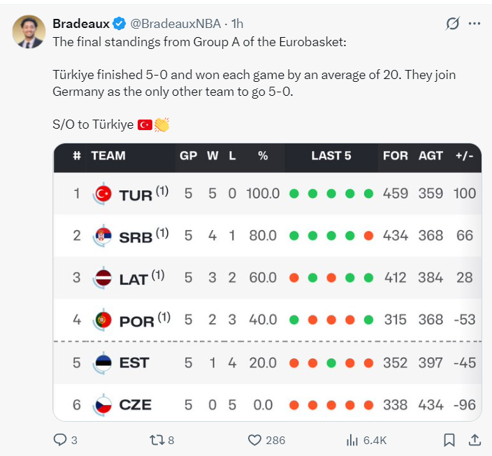 申京带领土耳其男篮与德国男篮一样豪取五连胜锁定小组第一,而土耳其所在的小组有本届欧洲杯夺冠第一热门塞尔维亚男篮。